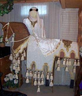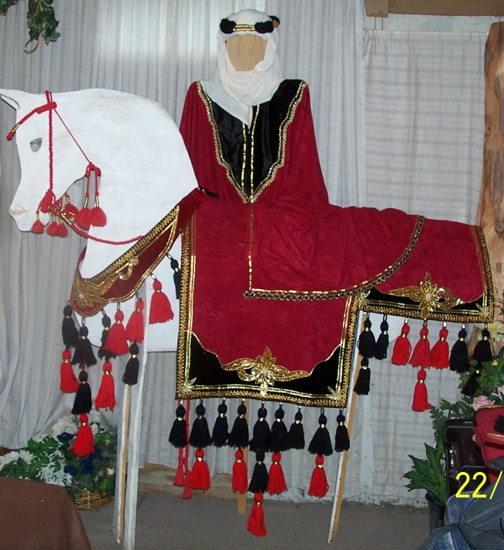 NOTE: My Arabian costumes can be used with most English saddles, which are placed under the blanket and the stirrup leathers re-attached through the slits in the blankets near the top. If you want to use a Western saddle, I can make cinch slits in the blanket for the Western saddle to fit on top of the blanket. I have other options for saddles, if these do not suit you. The hat & pants included in the costume are adjustable and will fit most adults sm to xl, and the caftan drapes well on most people also. I recommend the use of a hunt style boot with the costume, pant leg tucked in. A hand braided single bridle is included, but a leather bridle can be an option if desired. Call me with any questions. Carolyn (815) 947-3761.
